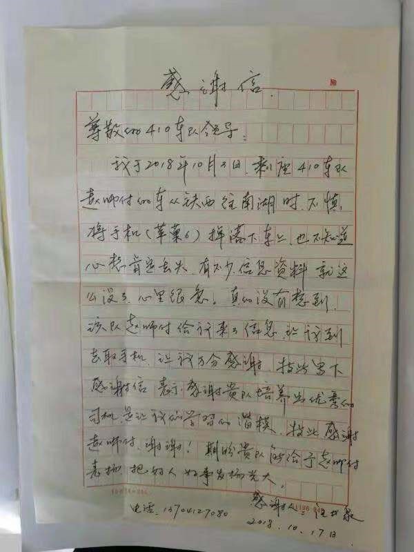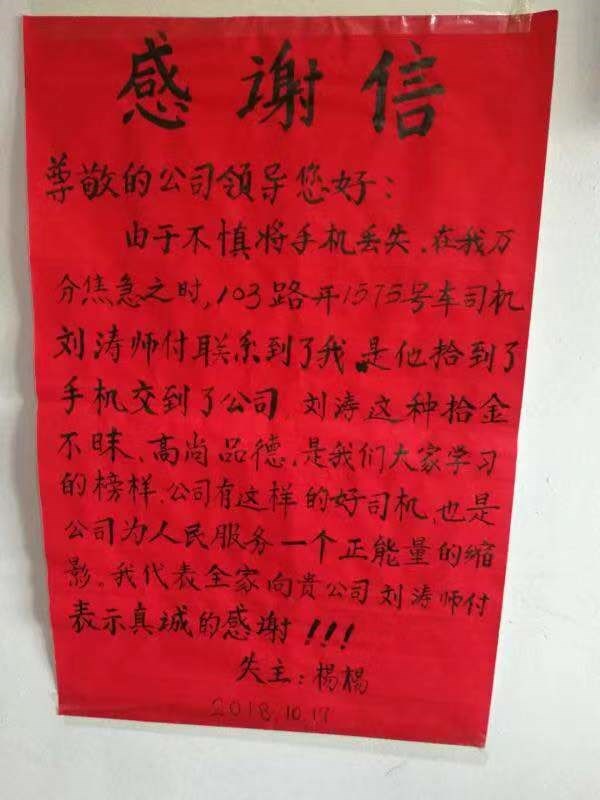 5.2018年10月16日,汪先生乘坐410線2061號駕駛員趙正博師傅車從鐵西往南湖走時(shí),不慎將手機(jī)掉到了車?yán),下車后,汪先生很是著急,因(yàn)槭謾C(jī)內(nèi)有不少信息,正在焦急中,趙師傅拾到他的手機(jī)給他的家人去了信息,并把手機(jī)交到410線調(diào)度室,汪先生帶著表揚(yáng)信來到調(diào)度室,調(diào)度及時(shí)把手機(jī)還給了失主,汪先生連連感謝,感謝貴公司培養(yǎng)出這樣優(yōu)秀的駕駛員。