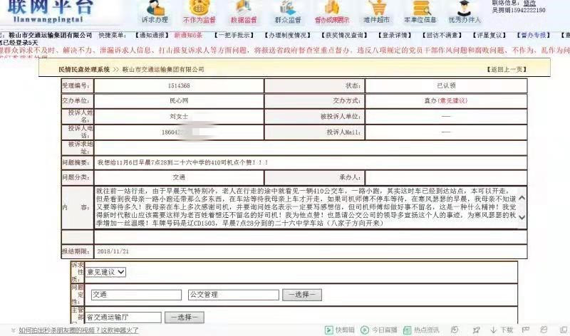 劉女士在反饋件上寫到:各位相關領導,你們好!事情的經(jīng)過是這樣:我母親早晨在鐵西八家子等車,由于不知道八家子這個站點已經(jīng)不停站,等了30多分鐘,經(jīng)過好心人的提醒就往前一站行走,由于早晨天氣特別冷,老人在行走的途中就看見一輛410公交車,一路小跑,其實這時車已經(jīng)到達站點,本可以開走,但是看到我母親一路小跑還帶那么多東西,在車站等待我母親上車才開走,如果司機師傅不停車等待,在寒風瑟瑟的早晨,我母親不知道又要等待多久!我母親在車上多次感謝司機,并要詢問姓名表示一定要寫感想信,但司機師傅卻做好事不留名,這是一種什么精神!我覺得新時代鞍山應該需要這樣為老百姓著想還不留名的好司機!我為他點贊!也懇請公交公司的領導多宣揚這個人的事跡,為寒風瑟瑟的秋季增加一絲溫暖!車牌號碼是遼CD1503,早晨7點28分到的二十六中學車站(八家子方向開來)。