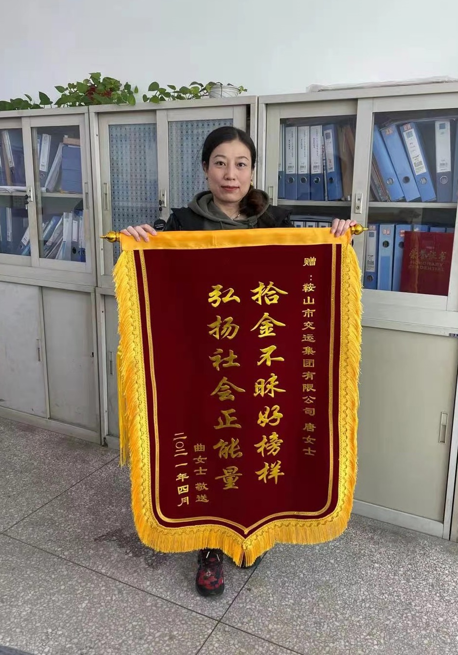 4月15日上午,市民曲女士帶刻有“拾金不昧好榜樣,弘揚(yáng)社會(huì)正能量”的錦旗,送到市交運(yùn)集團(tuán),感謝集團(tuán)員工“唐女士”第一時(shí)間里將拾到的價(jià)值萬余元的蘋果12手機(jī)交還給她。 據(jù)失主曲女士介紹, 4月10日,她在勝利會(huì)堂參加一場(chǎng)培訓(xùn)會(huì),會(huì)議結(jié)束后,才發(fā)現(xiàn)把自己載有重要資料的蘋果12手機(jī)丟失了。除了手機(jī)本身的價(jià)值以外,手機(jī)內(nèi)還存有孩子高考的各種重要資料,一時(shí)心急如焚。她報(bào)著試試看的心態(tài),用別人的手機(jī)拔打自己的號(hào)碼,沒想到立即有人接聽,并表示馬上將手機(jī)送過來。見面后,曲女士再三追問這位好心人的姓名,只了解到“好心人”姓唐,并一再表示無需感謝。曲女士再三表示誠意,“好心人”也沒有留電話,只留了微信號(hào)碼。曲女士最終通過翻看其朋友圈,發(fā)現(xiàn)“好心人”是市交運(yùn)集團(tuán)員工。